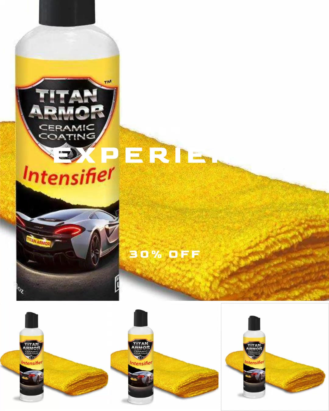 Introducing Titan Armor Ceramic Coating Intensifier-Water-Based. This advanced ceramic coating helps improve the look and feel of your vehicle. It guards against UV rays and will help protect your vehicle's finish against dirt, debris, and other contaminants. Formulated from the highest quality ethylene-vinyl acetate copolymers and nanotechnology, this 4oz bottle ensures your vehicle gets the most durable protection against moisture damage and corrosion. Its crystal clear finish and glossy sheen will give your vehicle a beautiful and luxurious finish. Enjoy the confidence of knowing your car or truck is safe from the elements with this top of the line ceramic coating technology.